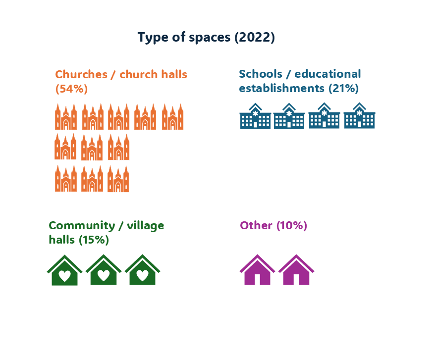 These are used by 90% of groups. Others include: Local Authority owned space, cultural venue, private club/hall (e.g. social club), residences (e.g. private home, care home)