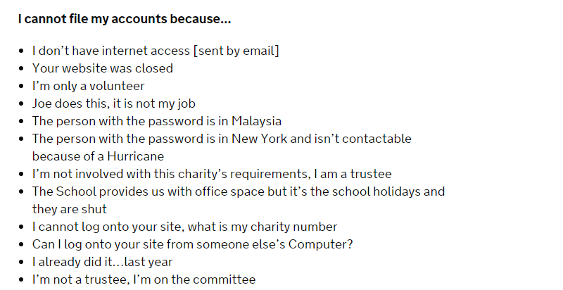 The Charity Commission has now published a list of the most feeble excuses for filing late, and although some are more obviously ridiculous than others ("'I don't have internet access' [sent by email]") 'I’m only a volunteer' is probably a common refrain…