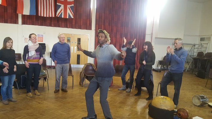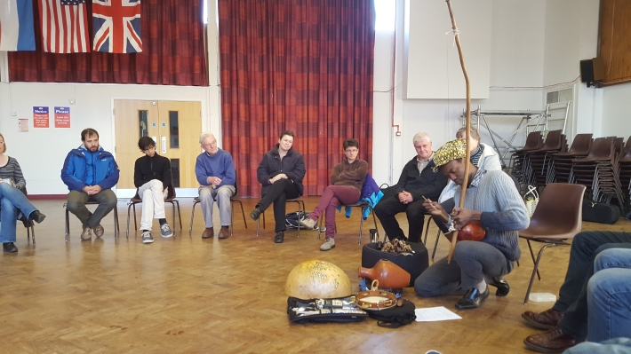 This was followed by an extended session where he broke down the rhythm of the Samba into its constituent parts, assigning different aspects of the rhythm to a group of us to clap out. Not as easy as it sounds! This was further embellished by using our own instruments in a way that was pretty much akin to 'on the fly' composing, with each group choosing how they wanted to play the notes of the rhythm, thus producing different interpretations between ensembles. Both challenging and huge fun it gave a real insight into composing and interpretation.