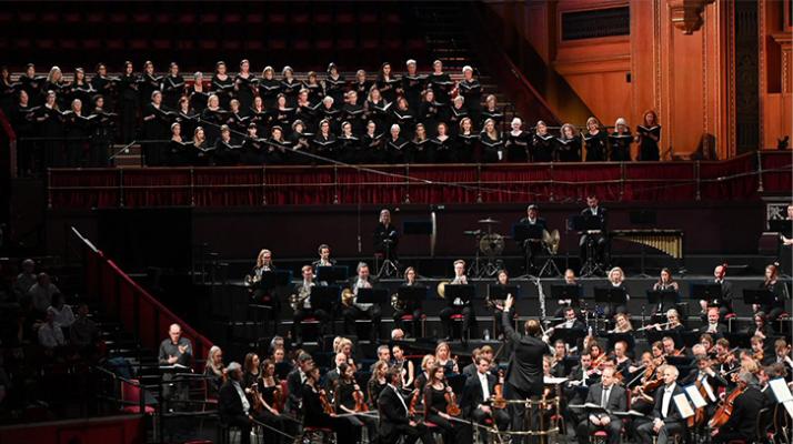 Paul Whittaker OBE (bottom left) in a concert with the Royal Philharmonic Orchestra, Philharmonia Chorus and conductor Vasily Petrenko. Royal Albert Hall, May 2022. Credit: RPO/Mark Allen