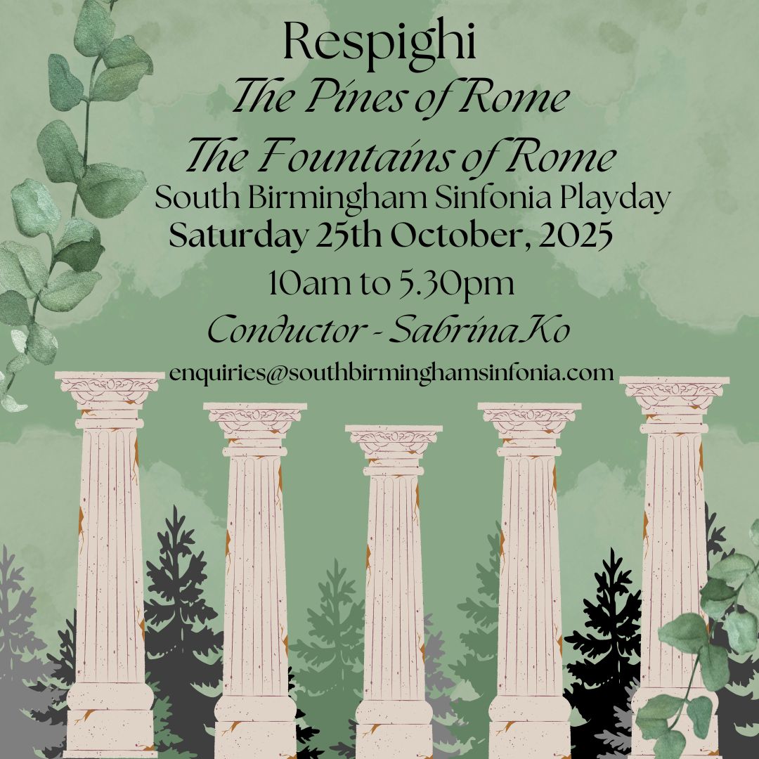 Join our Play Day exploring Resiphi's The Pines of Rome and The Fountains of Rome with our conductor Sabrina Ko.  We will have an informal performance at the end of the day.  Refreshments provided, please bring your own lunch or visit one of Bournville's nearby cafes.  Venue:  The Quaker Meeting House, Linden Road, Bournville, Birmingham B30 1JD.