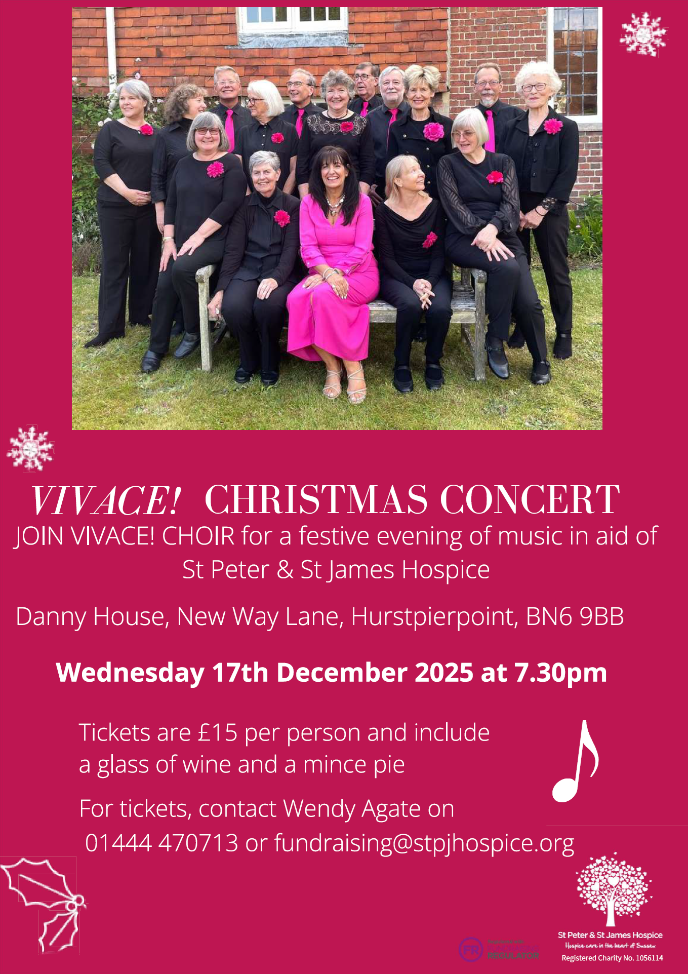 Join Vivace! for a festive evening of music in aid of St Peter and St James Hospice in the Great Hall of Danny House in Hurstpierpoint, West Sussex.