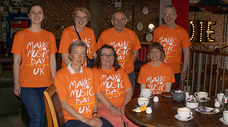 Members of SNLCS committee alongside Making Music's Inclusion Focus Programme Manager Elizabeth Palmer for Make Music Day 2024