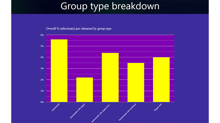 The most recent data about the spread of Covid infections at leisure-time music group rehearsals shows that 4% of reported infections involved more than two individuals.