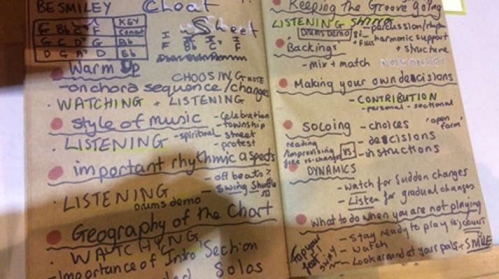 Pre-rehearsal, a good couple of hours studying the score and sound file I came up with some questions and ways of rehearsing each section of the piece. I wanted to deliver the rehearsal in such a way that encouraged the band without apprehension of the new styles and help their understanding of the piece.