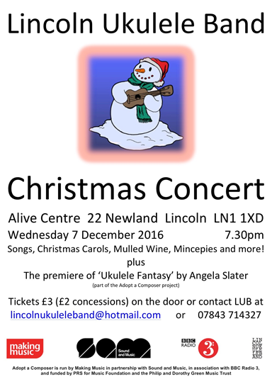 After working with the band for just over a year and seeing how they have changed and developed over this time has been wonderful to observe. I feel both the band and I have learnt a lot through this collaborative project. I’m greatly looking forward to the performance of ‘Ukulele Fantasy’ this Wednesday (7 December 2016). Tickets can be bought on the door and are also available by contacting lincolnukuleleband@hotmail.com or 07843 714327.