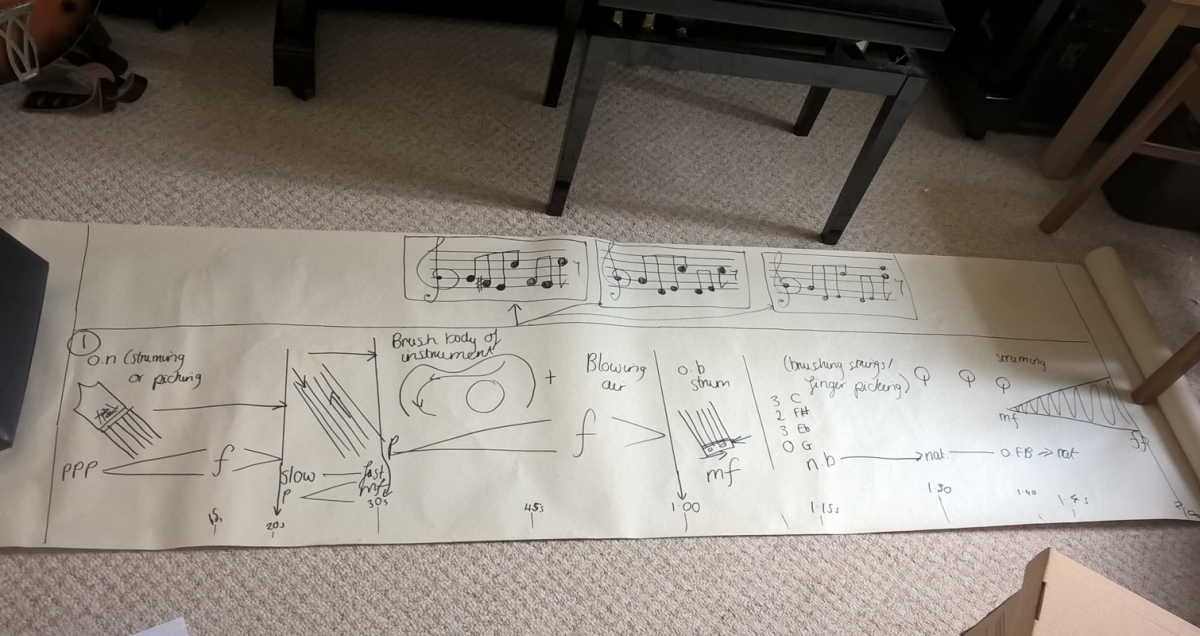 Over the last few weeks I have also begun to introduce the band to the beginning of the piece – a soundworld that explores the sounds of the night, with a stillness that begins to rustle building gradually in texture until it bursts out, marking the arrival of the energetic rhythmic section. For this beginning section I have created a number of symbols that the band have been learning to refer to different unusual sounds and techniques on the ukulele. Each bit is loosely timed before moving on the next section. I used lining paper to draw each graphic score part out in large form for the group to learn from together before creating individual parts to learn from.